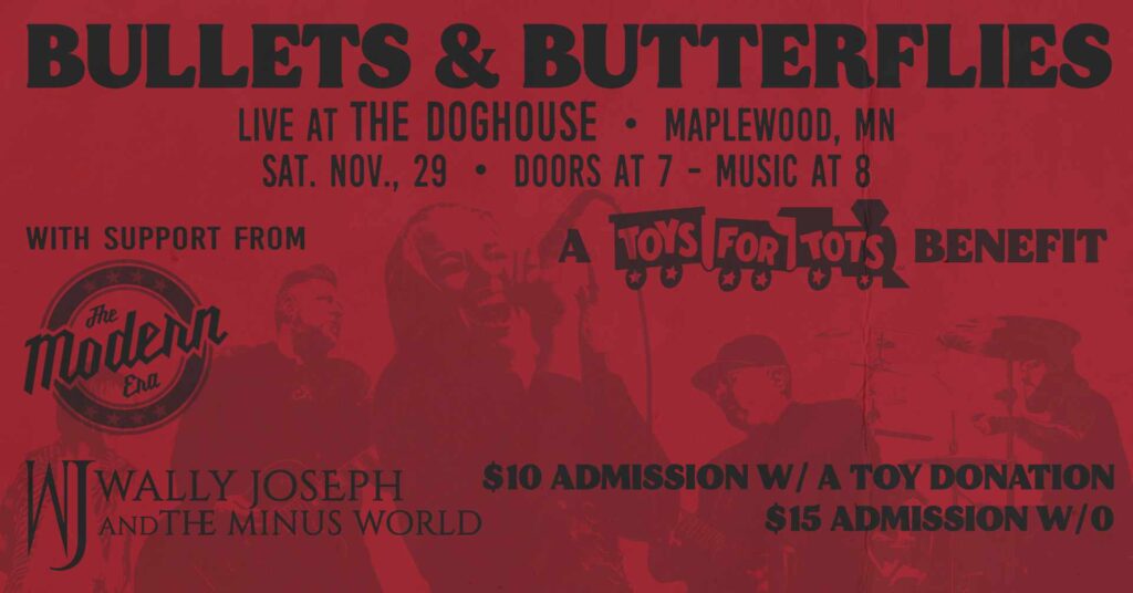 Come spread some holiday love with Bullets and Butterflies, The Modern Era, and Wally Joseph and The Minus World at The Dog House in Maplewood!! This show is a Toys For Tots benefit so bring a gift for those in need. We can’t wait to celebrate the holiday season with YOU:)