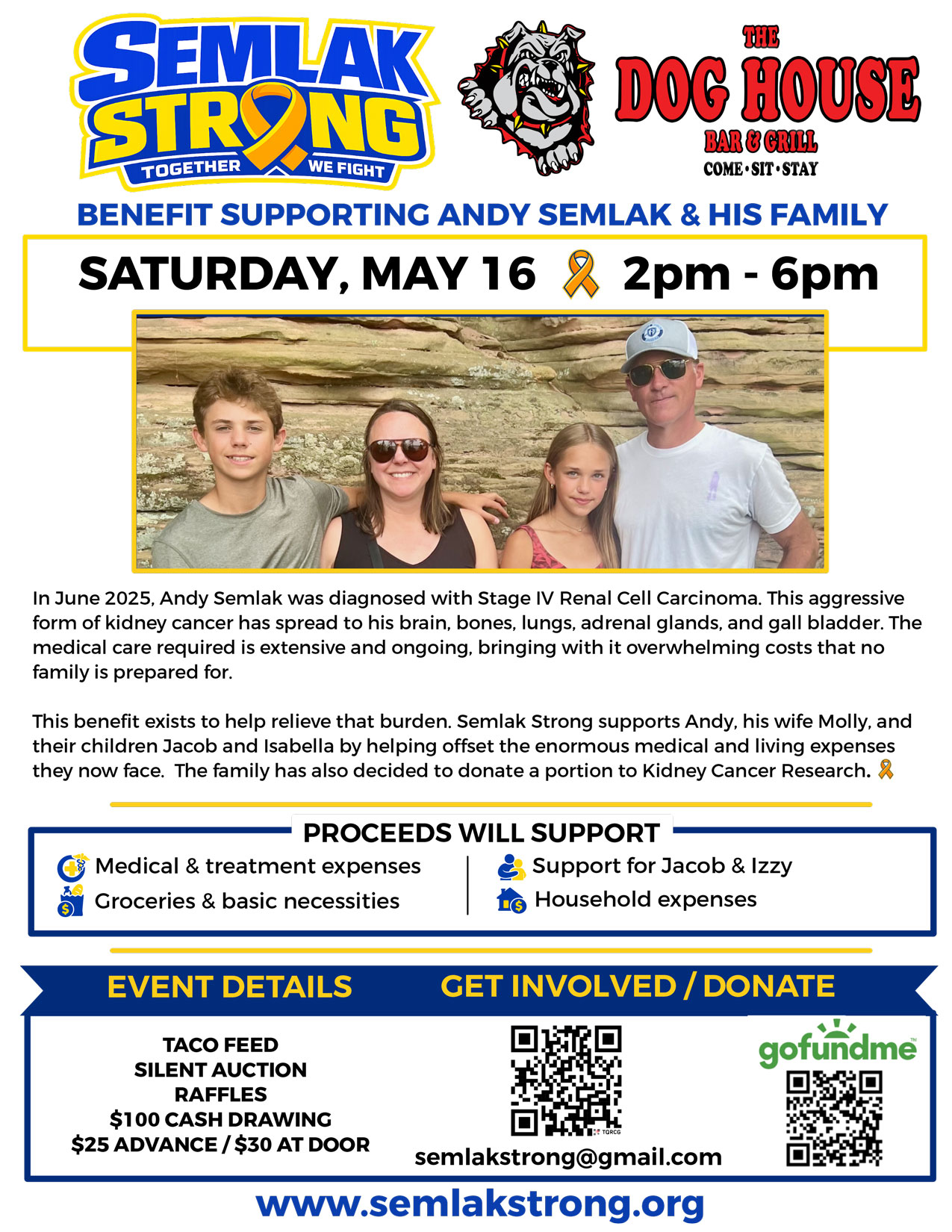 The Dog House Bar & Grill is proud to host the Semlak Strong Benefit — a community fundraiser supporting Andy Semlak and his family as they navigate one of life’s most difficult journeys.