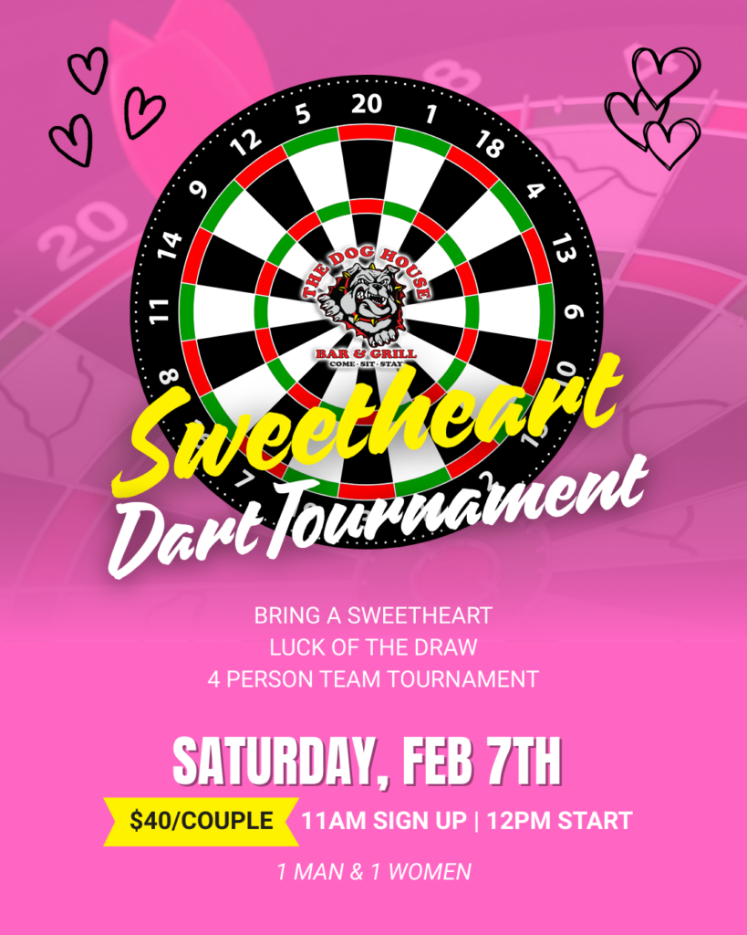 Grab your sweetheart and get ready to hit the bullseye! The Dog House Bar & Grill is hosting our annual Sweetheart Dart Tournament just in time for Valentine’s Day!
