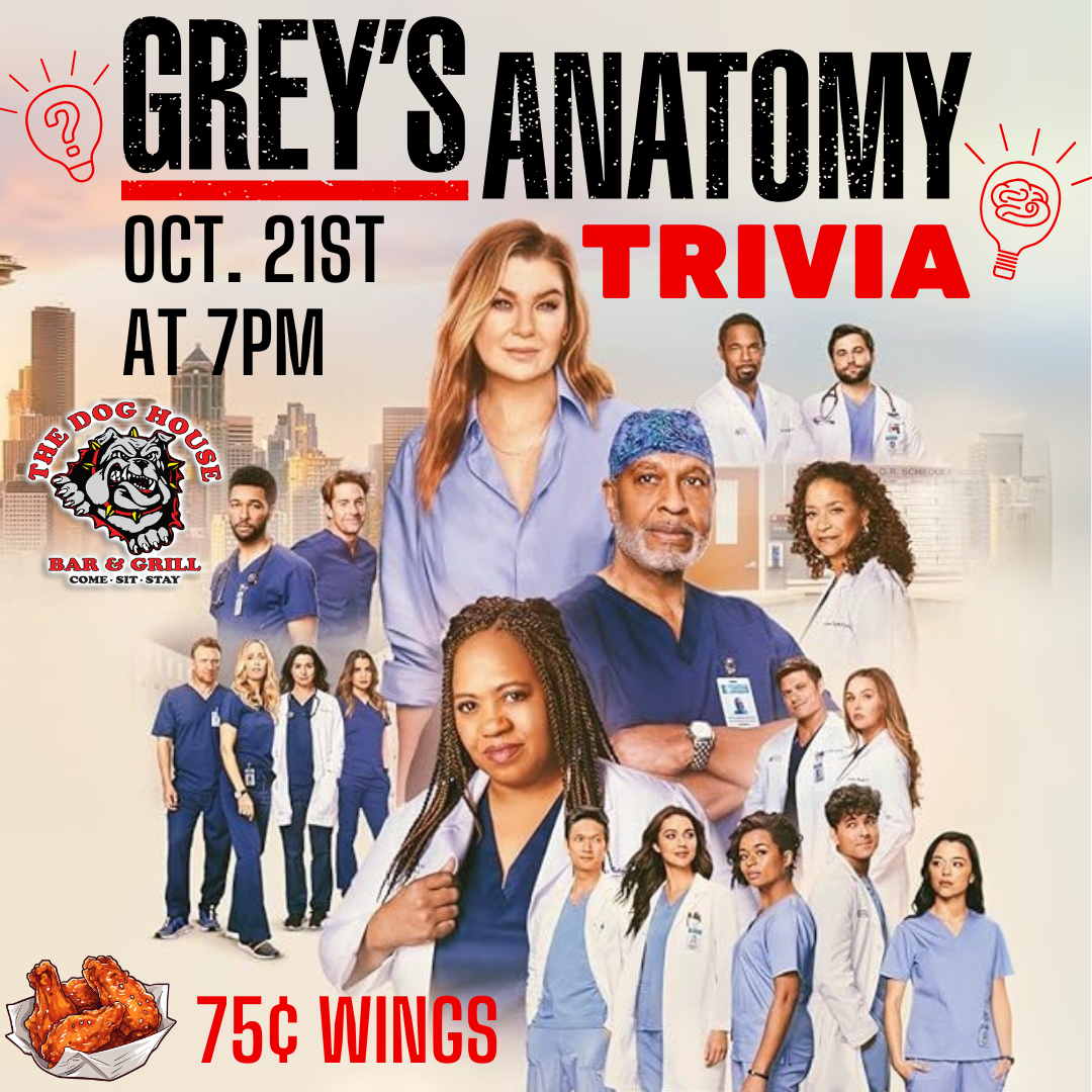 Paging All Doctors…Grey Sloan needs you at The Dog House!🍗 $.75 Wings all night🎁 $100 in prizes Late Night Happy Hour starting at 9pm! Scrub in, grab your trivia crew, and prove you’ve got more brains than Dr. Bailey. |